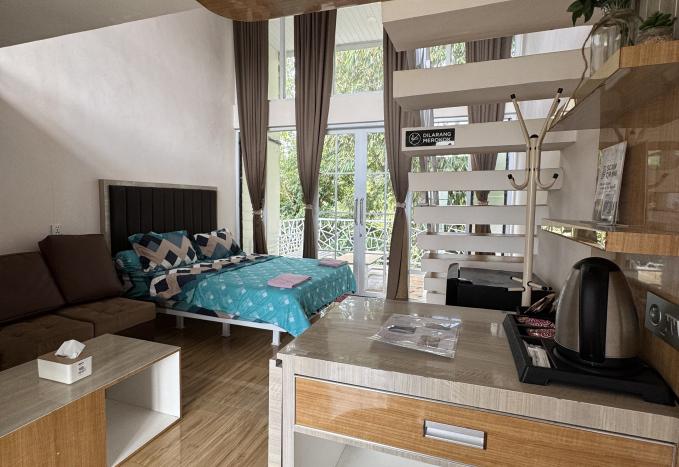 The villa is thoughtfully furnished with modern amenities, a private balcony with serene forest views, a cozy living area, a pantry, and large windows that allow natural light to fill the space. The perfect setting for a peaceful retreat amidst nature.